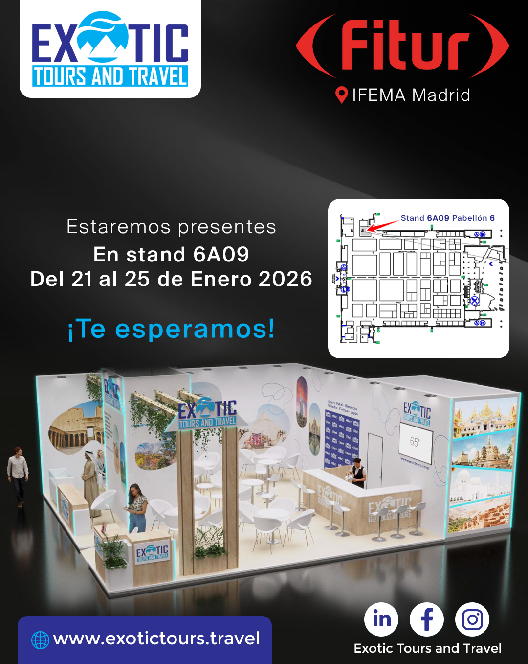 Exotic Tours and Travel, nossa renomada agência especializada em viagens a destinos por todo o mundo, confirmou sua presença na próxima edição da FITUR 2026, a Feira Internacional de Turismo, que será realizada em Madrid de 21 a 25 de janeiro de 2026. Ocuparemos um espaço destacado em um dos pavilhões, onde apresentaremos novidades e atenderemos a nossos visitantes. Com uma área de 66 metros quadrados (11 metros de largura por 6 metros de altura), o stand da Exotic Tours and Travel será um verdadeiro oásis no meio da feira.